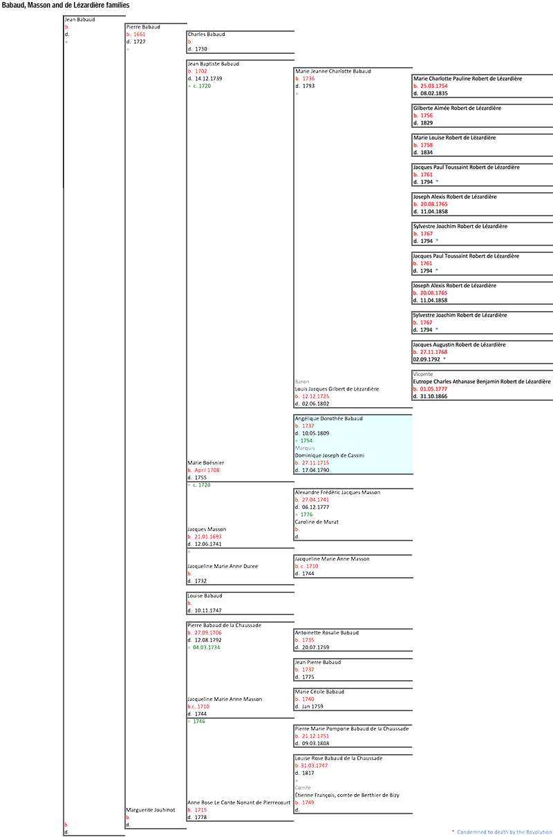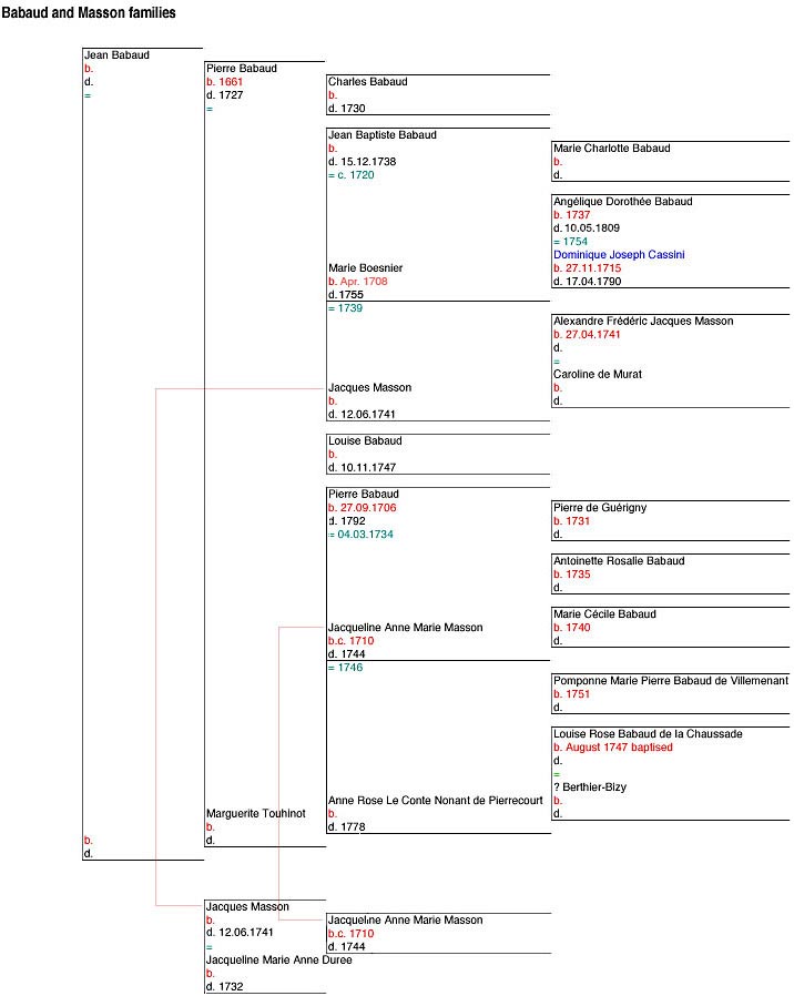Jean Babaud and Marie Boësnier were married in 1728 and had two daughters, Marie Charlotte Jeanne – who married Louis Jacques Gilbert Robert, Baron de Poiroux and Marquis de Lézardière in 1750 – and Angélique-Dorothée Babaud, the latter and her relationship with the Cassini family being my reason for taking an interest in the Babaud and Masson families.